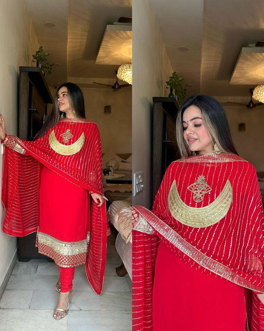 "Elegant Chinon Embroidered Sequence Suit Set with Lace-Trimmed Plazzo and Organza Dupatta"