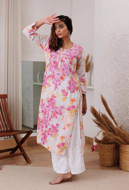 Women's Cotton White Floral Straight Kurta with Palazzo