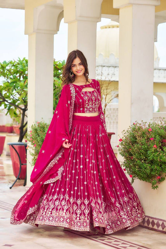 "Exquisite Embroidered Chinon Lehenga Set with Dupatta, Blouse & Embroidery Belt – Fully Stitched"