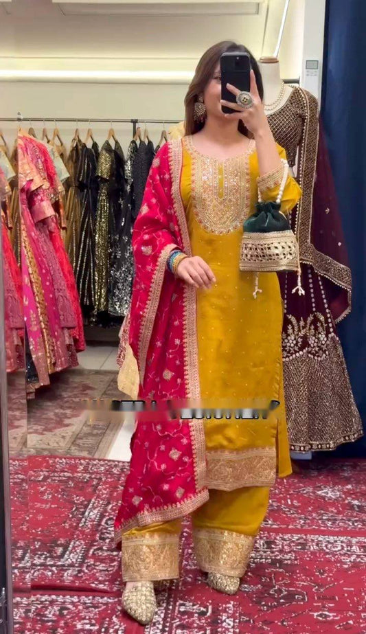 "Pure Cinon Silk Embroidered Top, Pant & Dupatta Set – Ready to Wear"