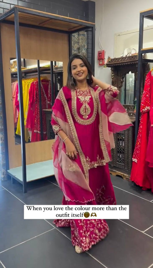 “Chinon Silk Ensemble with Mirror Work & Sequins: Elegant Top, Plazo, and Dupatta Set”
