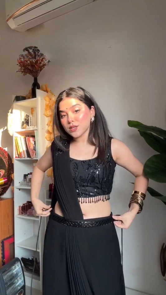 "Elegant Foux Gorgette Blouse, Ready-to-Wear Dhoti & Waist Belt Set with Thread & Sequence Work"