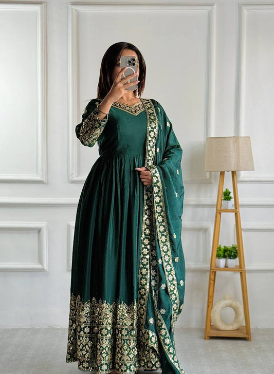 "Luxury Vichi Silk GWON with Embroidered Dupatta – Fully Stitched & Ready to Wear"