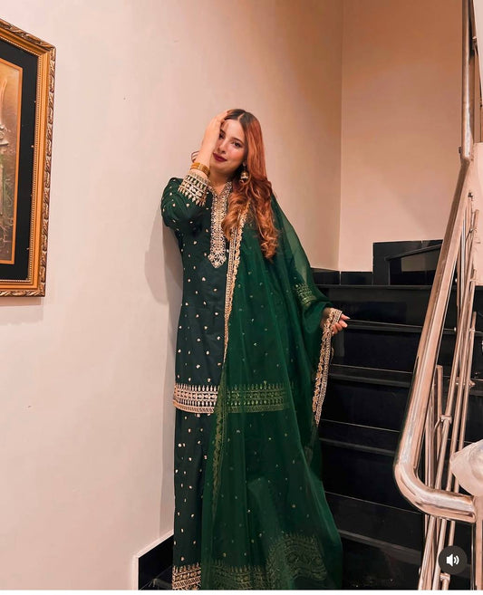 "Elegant Cinon Silk Embroidered Top, Sarara, and Dupatta Set – Fully Stitched, Ready to Wear"