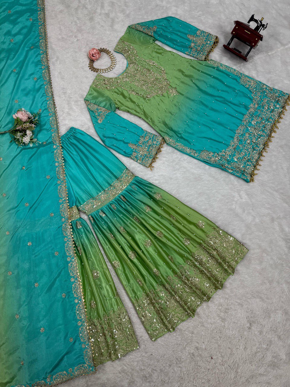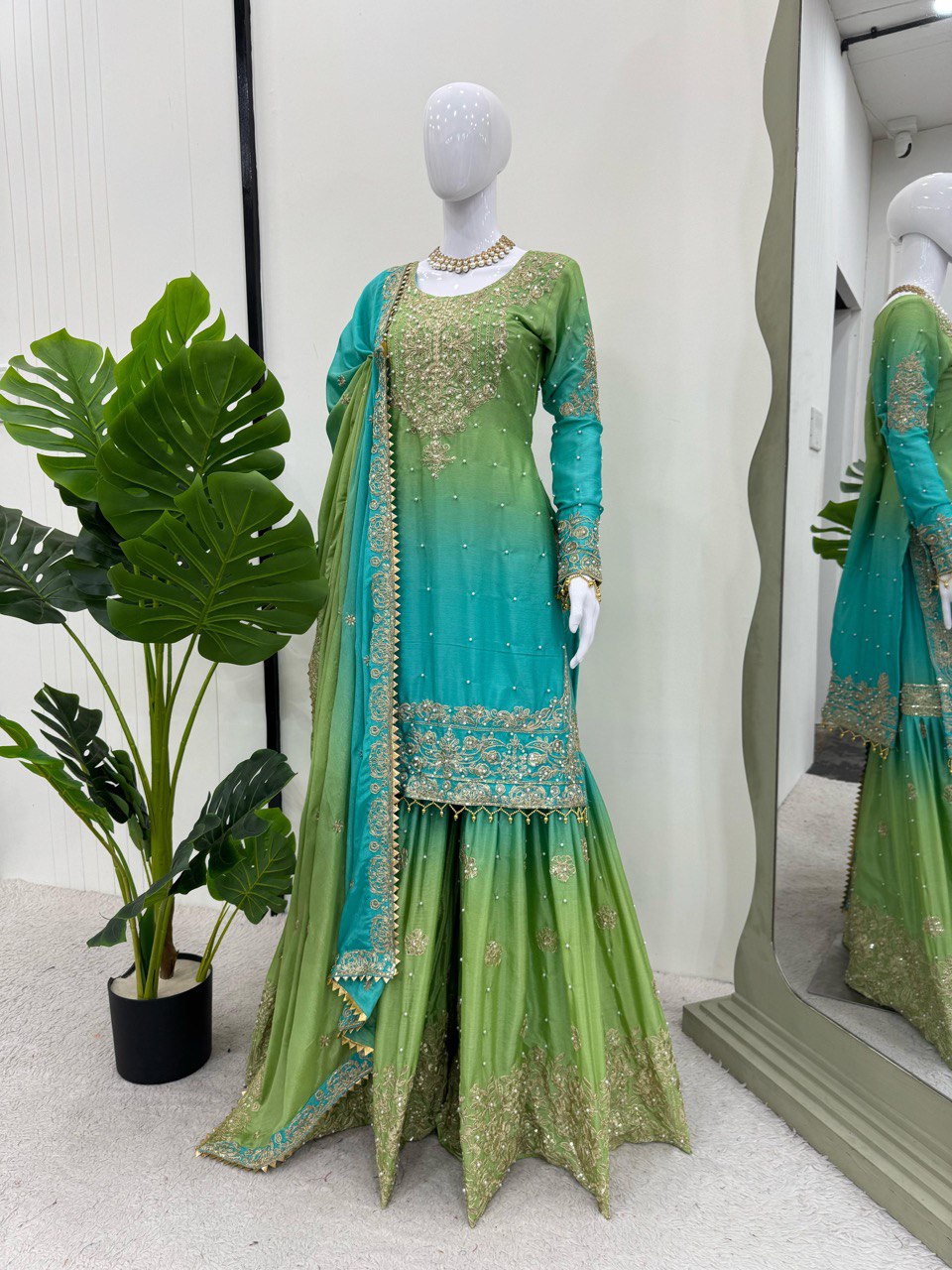 Introducing a stunning Designer Suit crafted from luxurious Heavy Chinon fabric, featuring exquisite coding, sequence work, and beautiful pearl detailing. This elegant set also includes a Sharara and Dupatta, both in the same luxurious Heavy Chinon fabric with intricate embellishments, including coding, sequence work, pearls, and fancy lace accents.