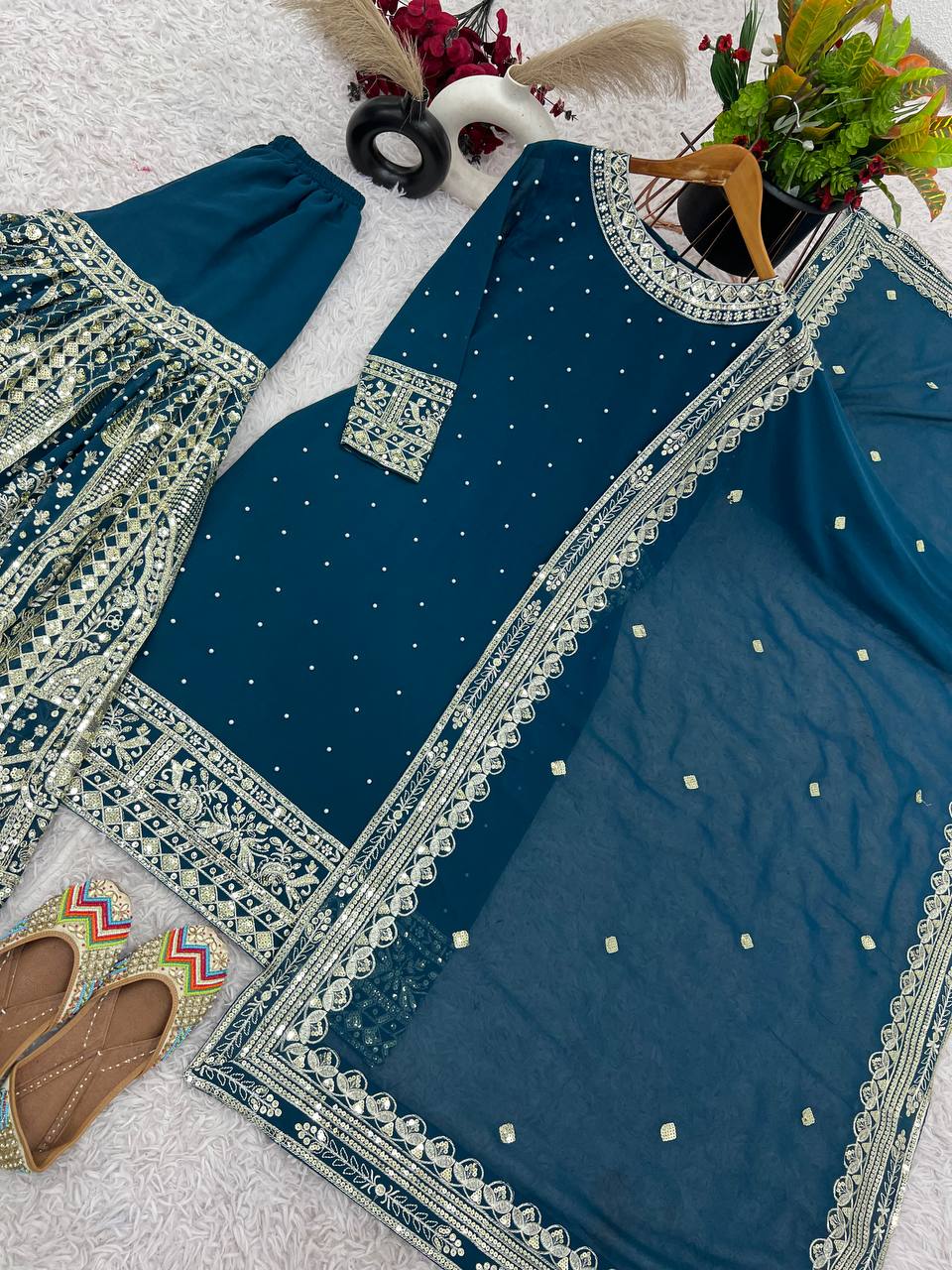 - Gharara Fabric: Heavy Faux Georgette with Full Heavy Embroidery Sequence Work and Rivet Moti Work