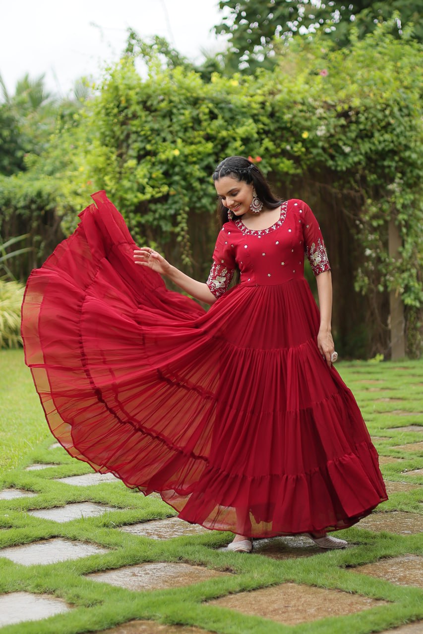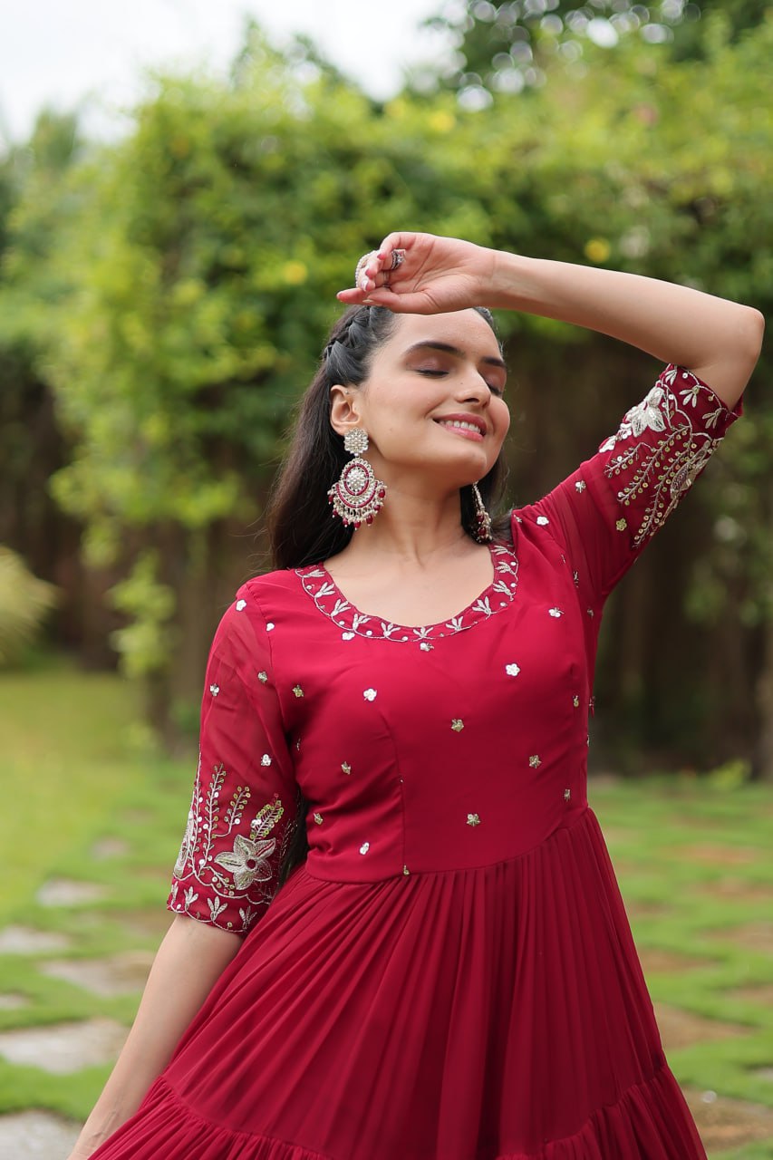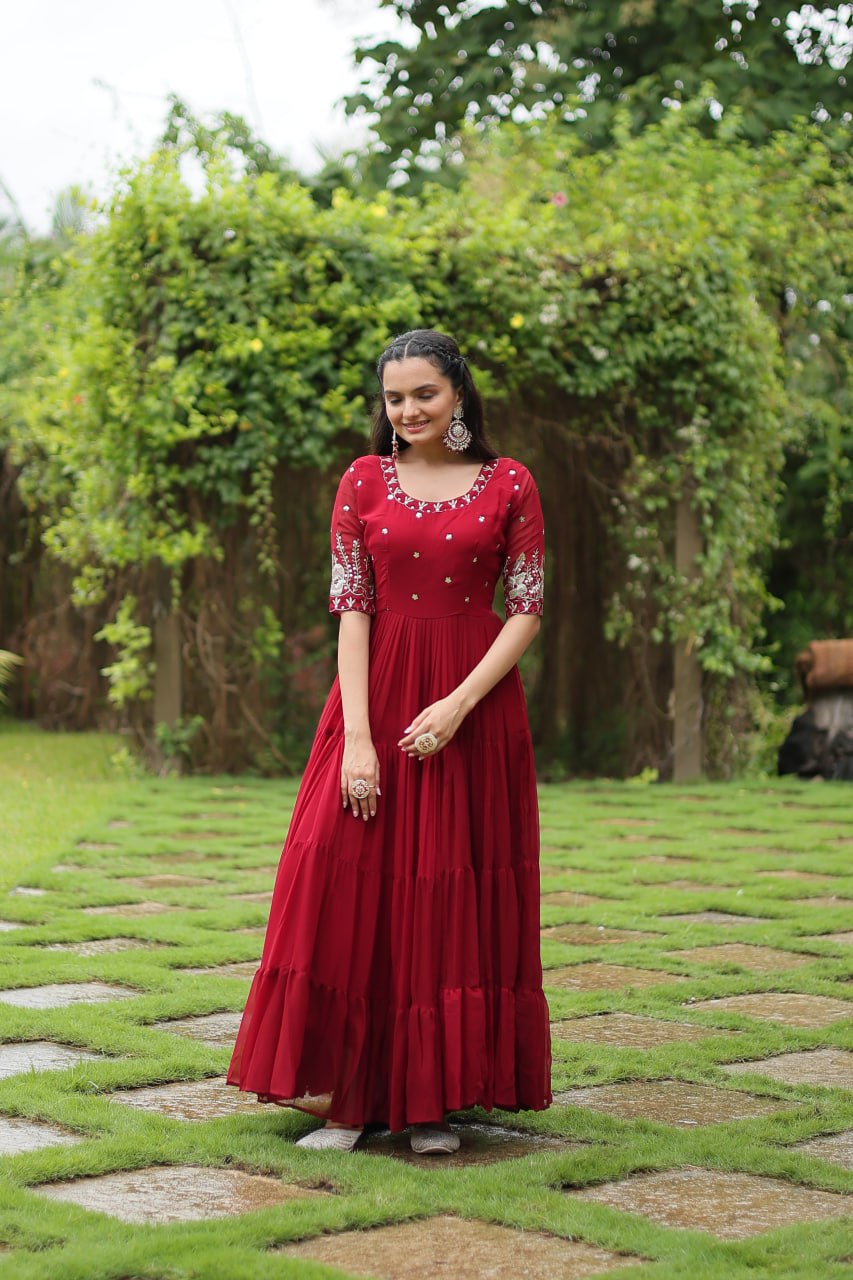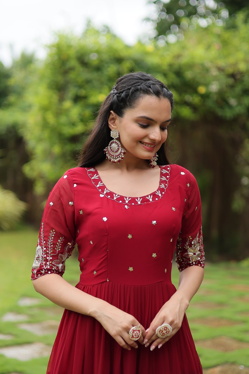Introducing our luxurious designer gown, crafted with high-quality Zari-thread and sequins embroidery. Perfect for the woman who deserves to shine!