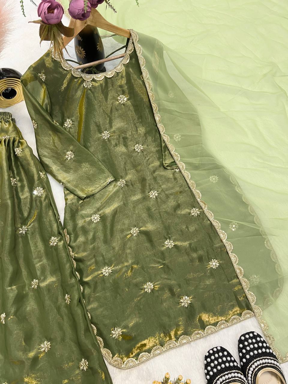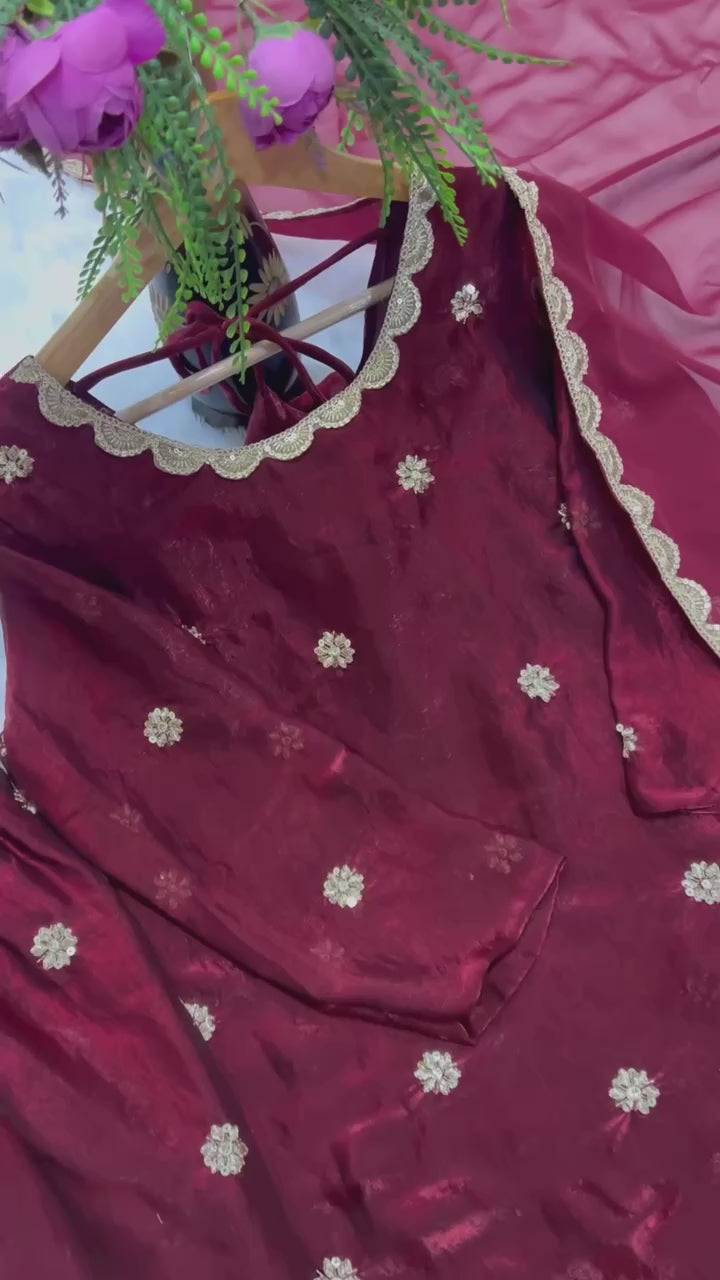 Experience timeless elegance with this exquisite Designer Party Wear ensemble featuring a richly embroidered Top, Farshi Salwar, and Dupatta. Crafted from luxurious Heavy Fandy Crushi Silk, the outfit showcases delicate sequin embroidery and fine detailing. Fully stitched and ready to wear, it combines royal style with ultimate comfort — perfect for festive celebrations, weddings, and special occasions.
