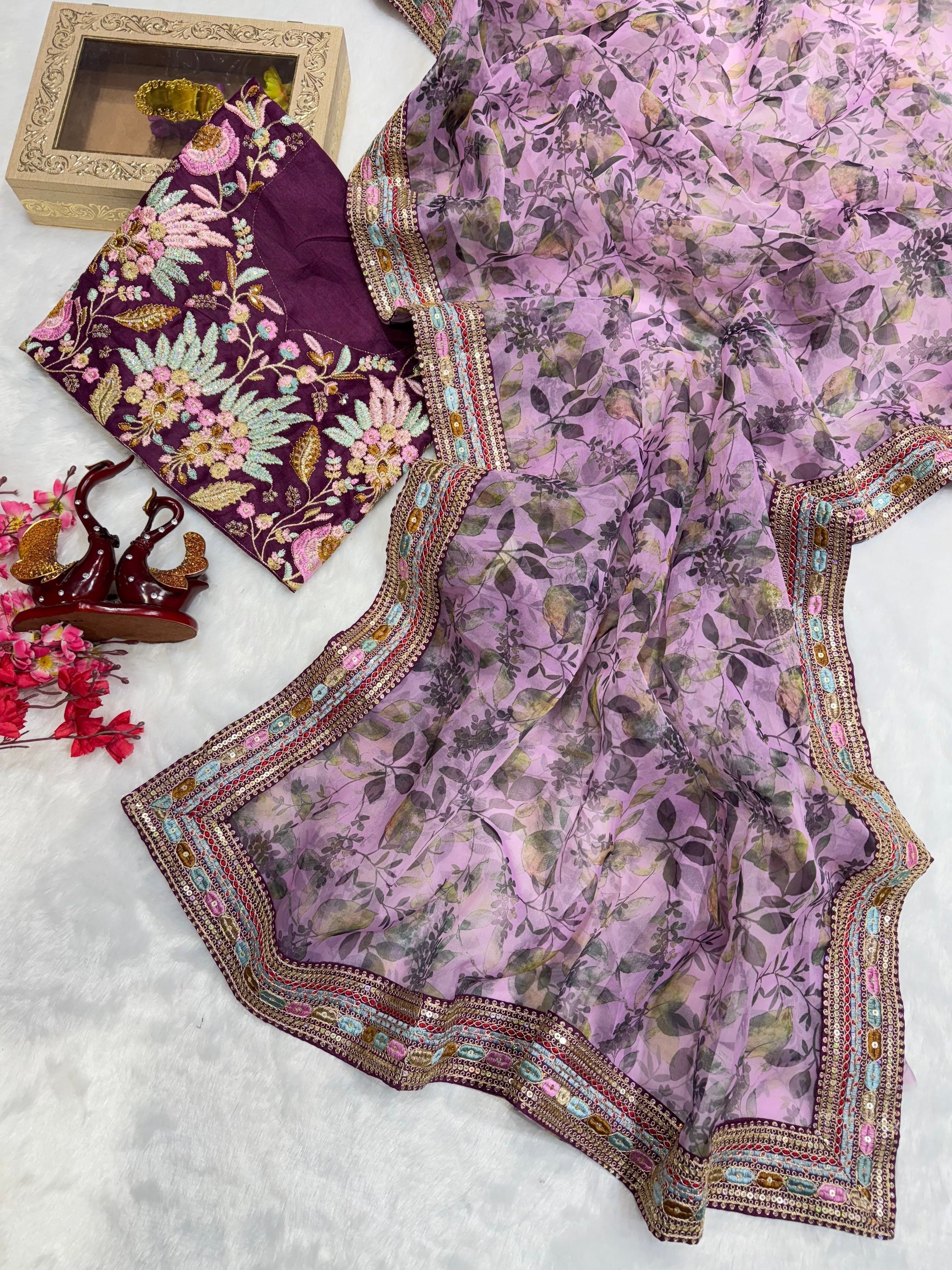 Saree Fabric: Heavy Soft Organza with beautiful prints, offering a graceful drape and vibrant charm