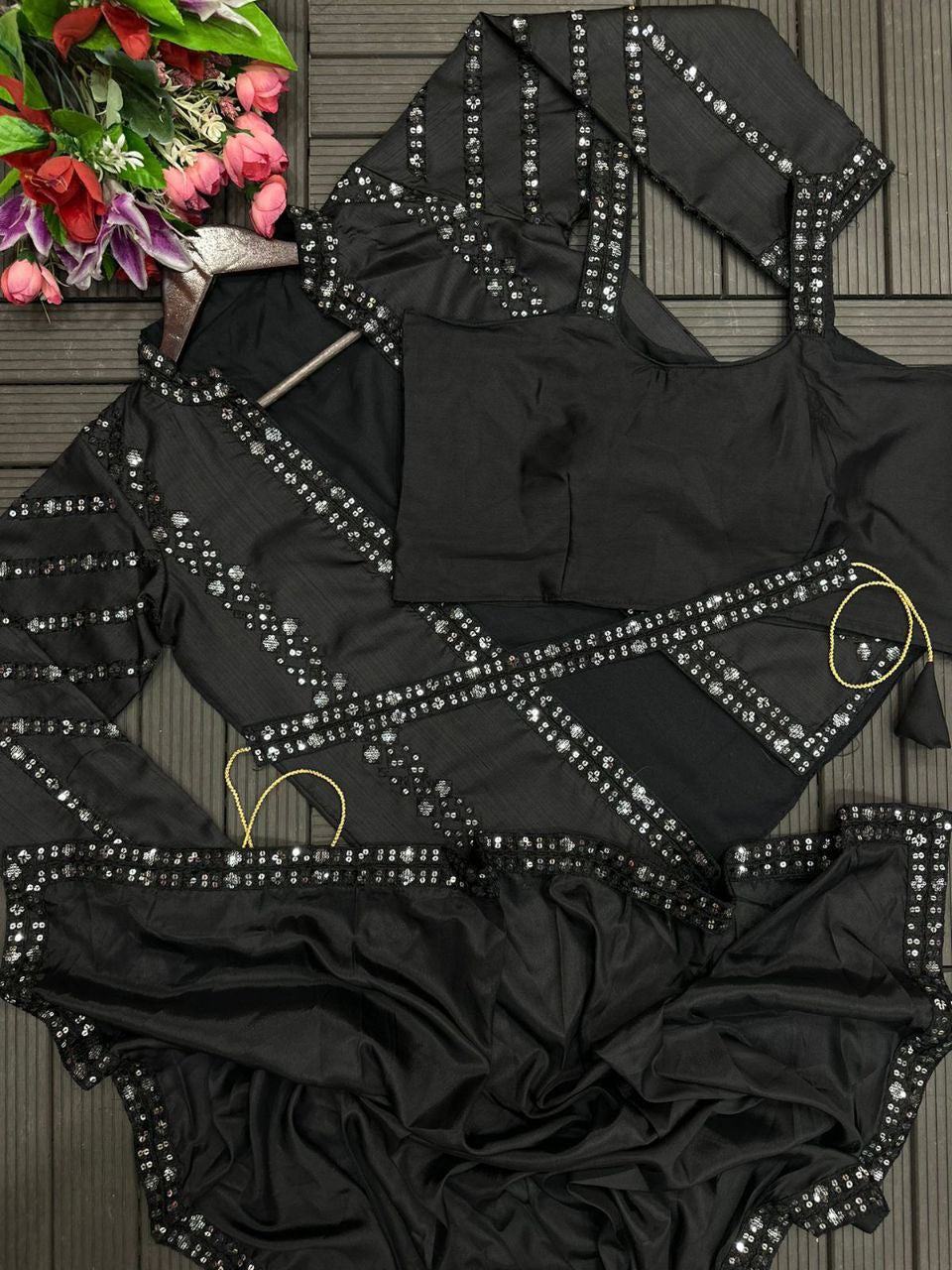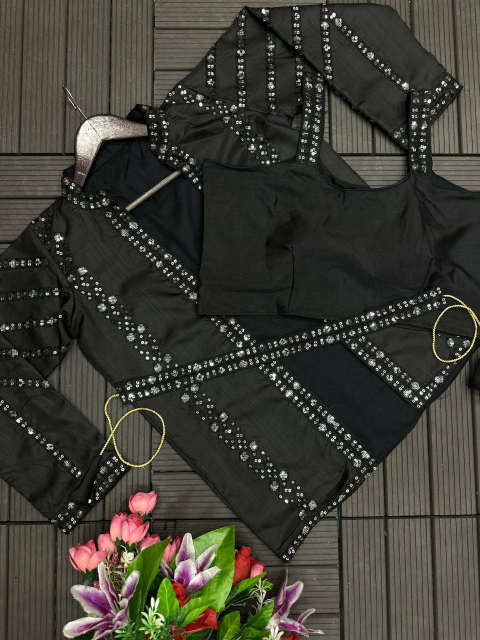 Elegant Heavy Satin Embroidered Saree Set with Jacket & Blouse