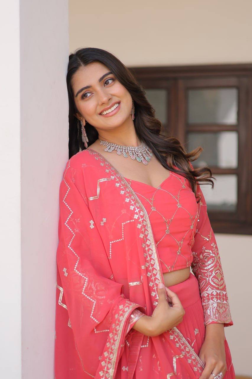 This Festival Lehenga Choli SetΒ is crafted in luxurious heavy Fox Georgette fabric and detailed with beautiful embroidery sequence work. The lehenga comes fully stitched with a voluminous flair, perfect for any festive occasion. The choli is available as unstitched to provide customization options, while the dupatta adds an extra layer of sophistication with its intricate embroidery. Ideal for weddings, festivals, and other celebrations.