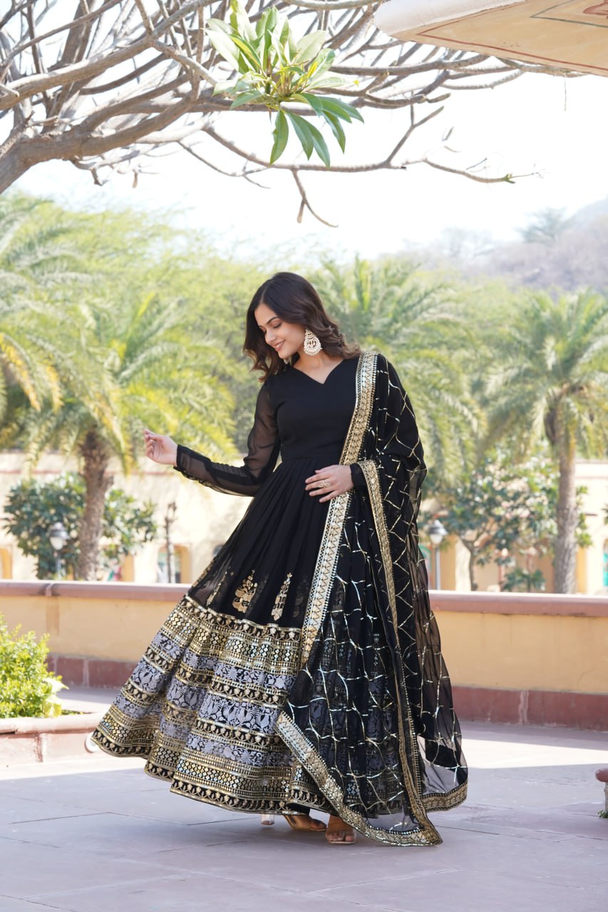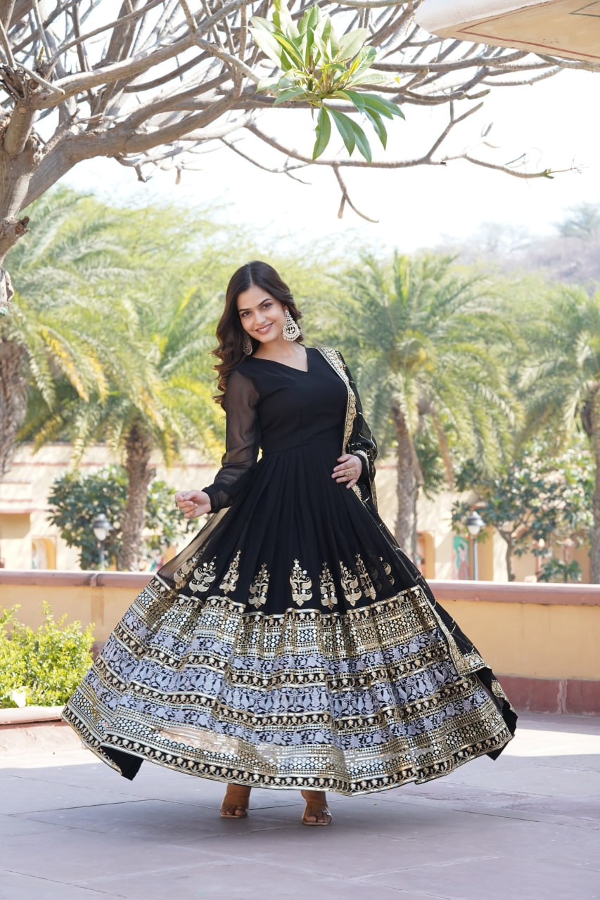 💃🏼 Graceful V-Neck Faux Blooming Gown with Dupatta With Attractive Jari and Thread Embroidered Sequins work with Lace Border