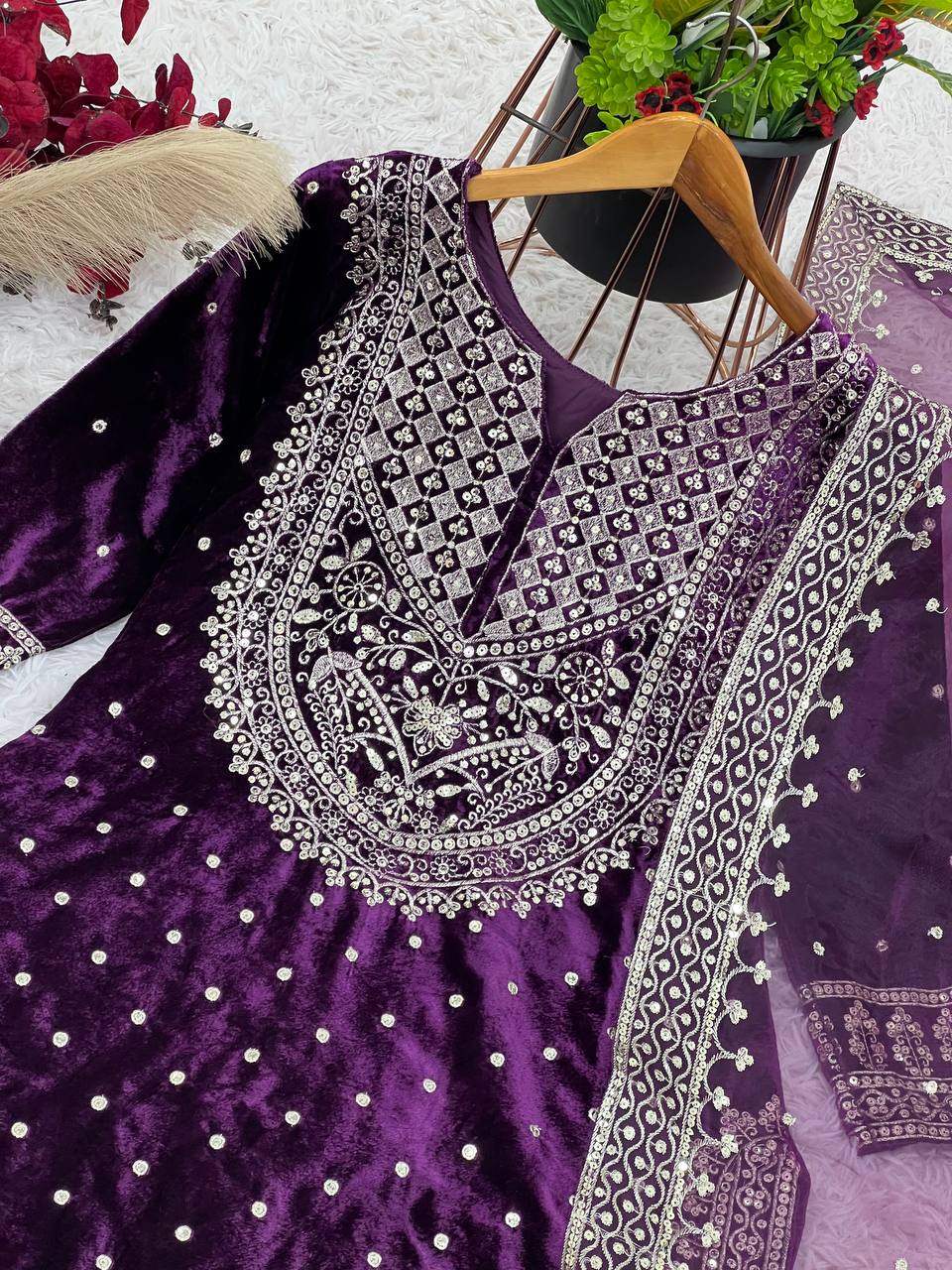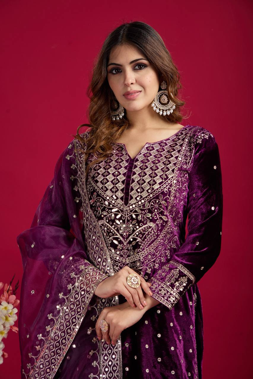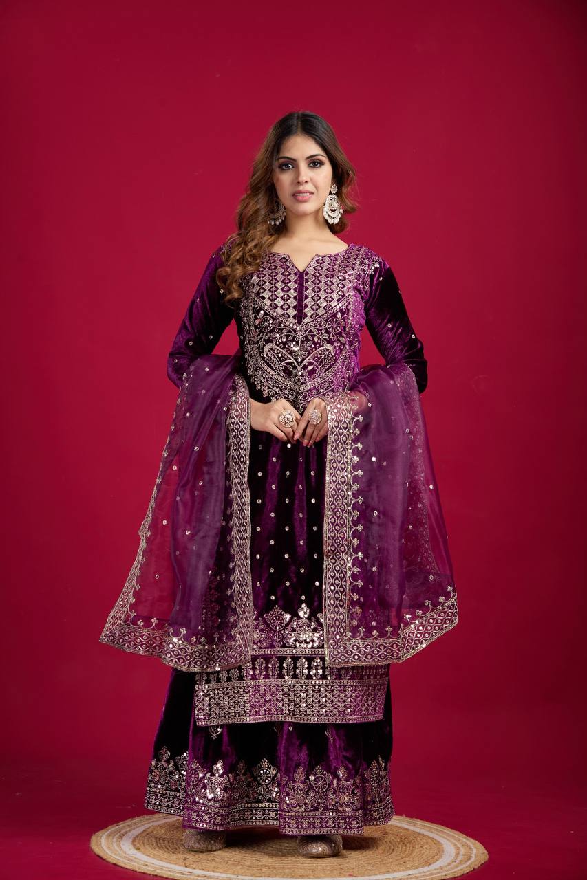 👗 Top Fabric: Heavy Viscose Velvet with Heavy Embroidery Sequence Work and Sleeves