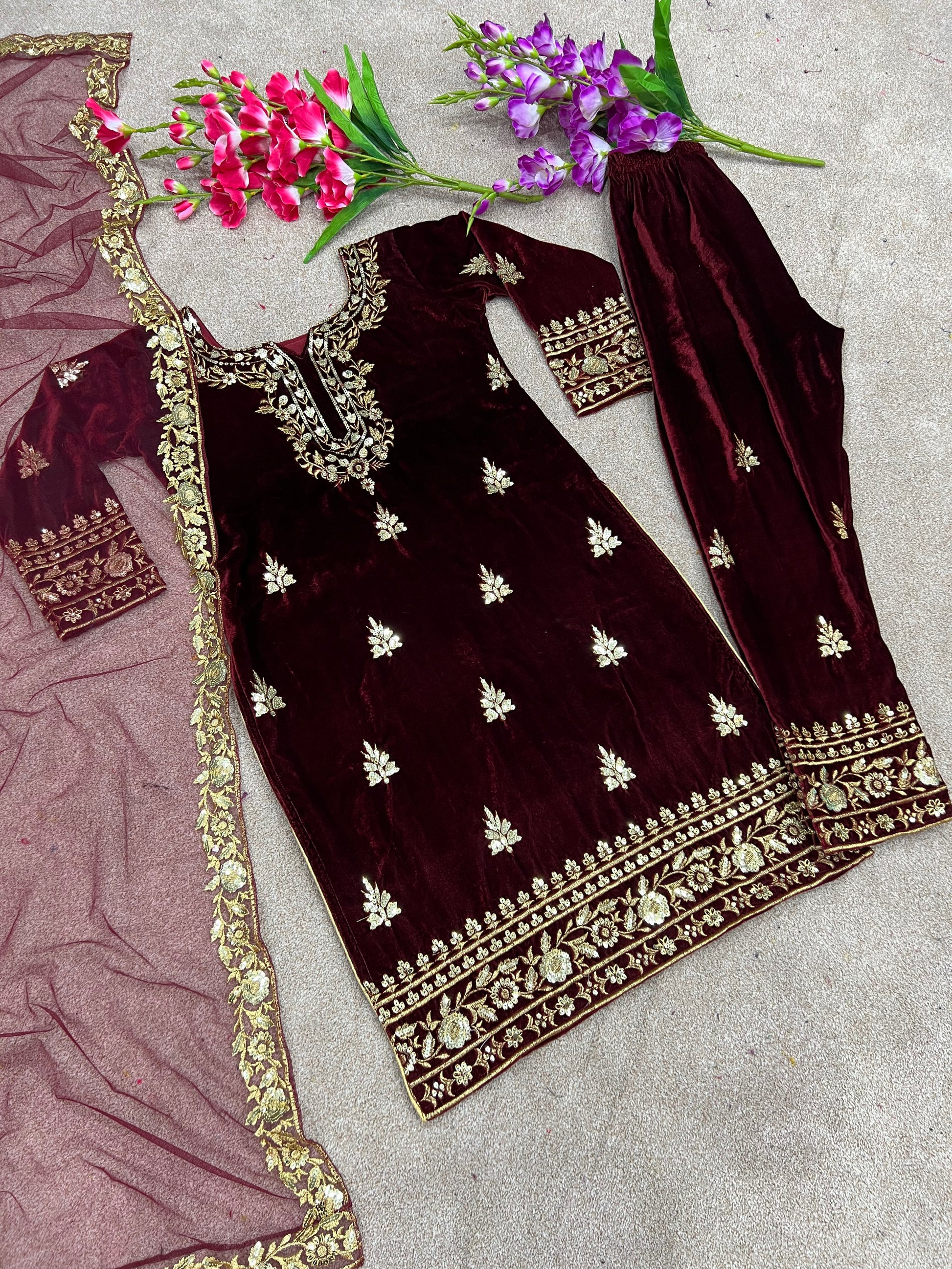 Heavy Viscose Velvet with 5mm heavy embroidery sequence work Kurta Pant with Dupatta