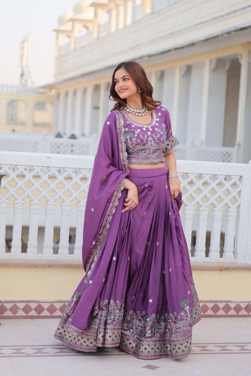This Festival Lehenga Choli is designed with luxurious Pure Chinon fabric, adorned with heavy embroidery sequence and thread work for a premium look. The lehenga features a rich flair and is complemented with a matching dupatta, making it perfect for any festive or wedding occasion. The choli is provided unstitched to allow for customized fitting, while the lehenga comes fully stitched with a beautiful dori latkan closure.