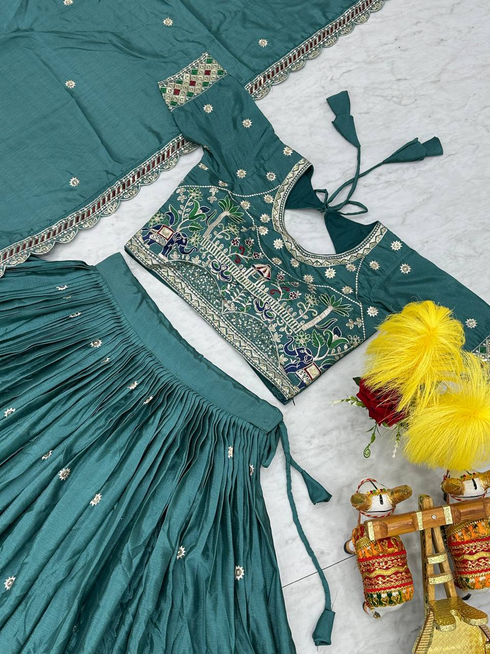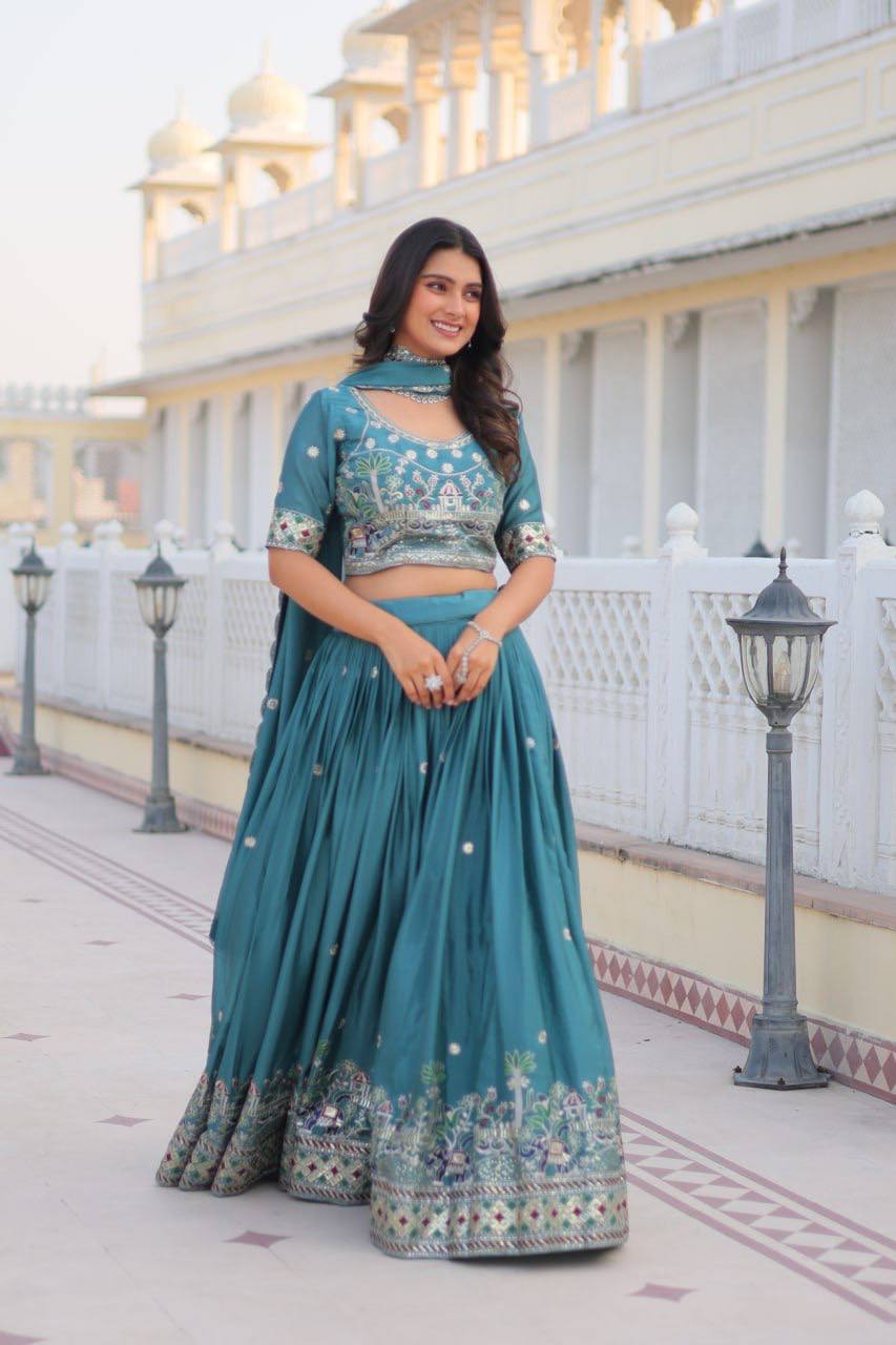 This Festival Lehenga Choli is designed with luxurious Pure Chinon fabric, adorned with heavy embroidery sequence and thread work for a premium look. The lehenga features a rich flair and is complemented with a matching dupatta, making it perfect for any festive or wedding occasion. The choli is provided unstitched to allow for customized fitting, while the lehenga comes fully stitched with a beautiful dori latkan closure.