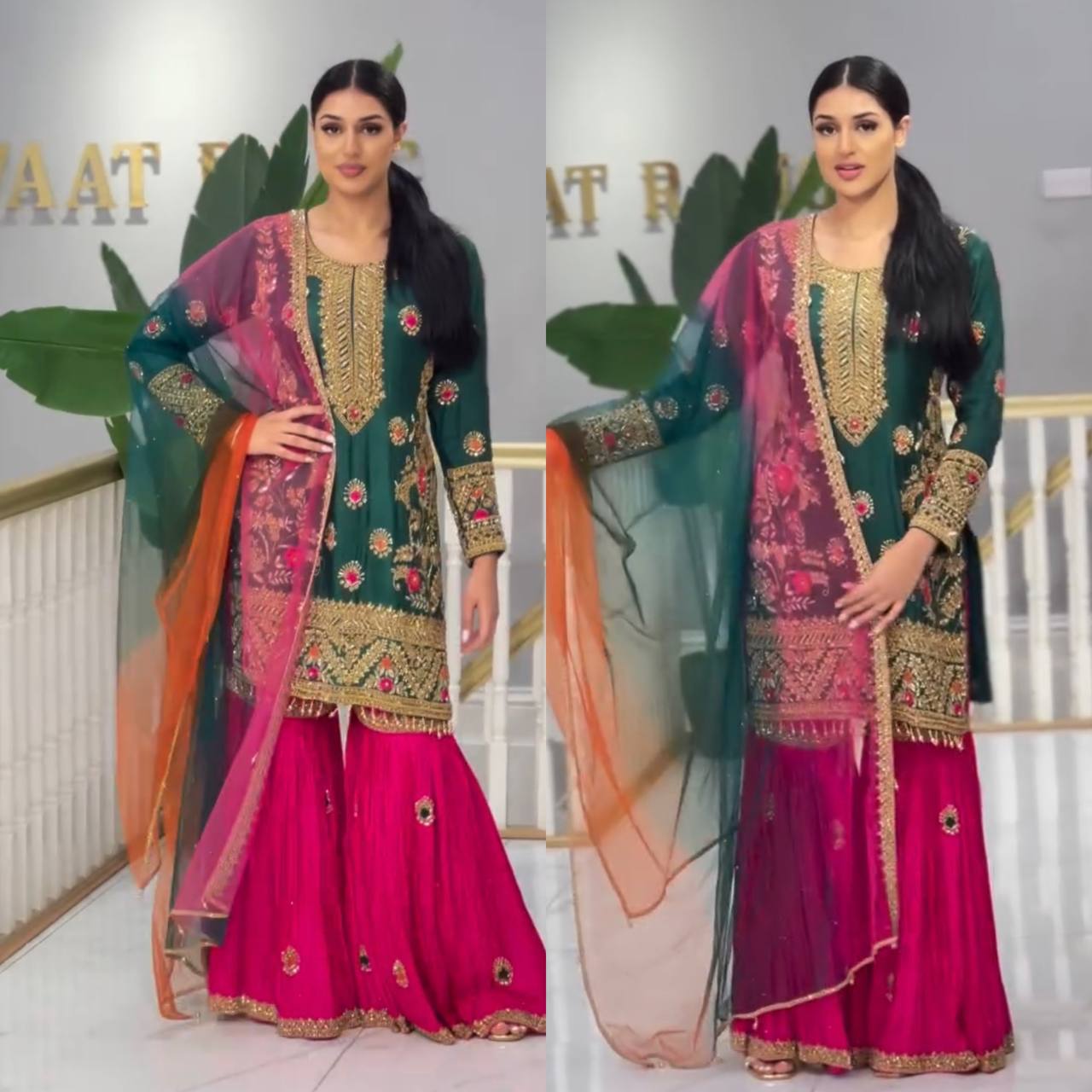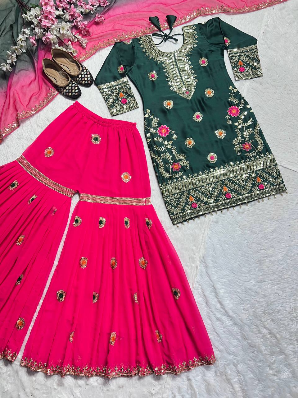 - Plazo Fabric: Heavy Blooming Silk with 5mm Embroidery Sequence, Fully Flared