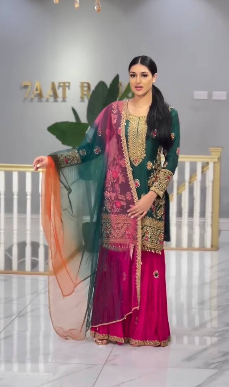 Malay Silk with Heavy 5mm Embroidery Sequence Work Kurta Sharara with Dupatta