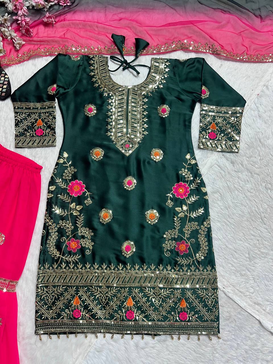- Top Fabric: Malay Silk with Heavy 5mm Embroidery Sequence Work and Full Sleeves with Latkan Dori