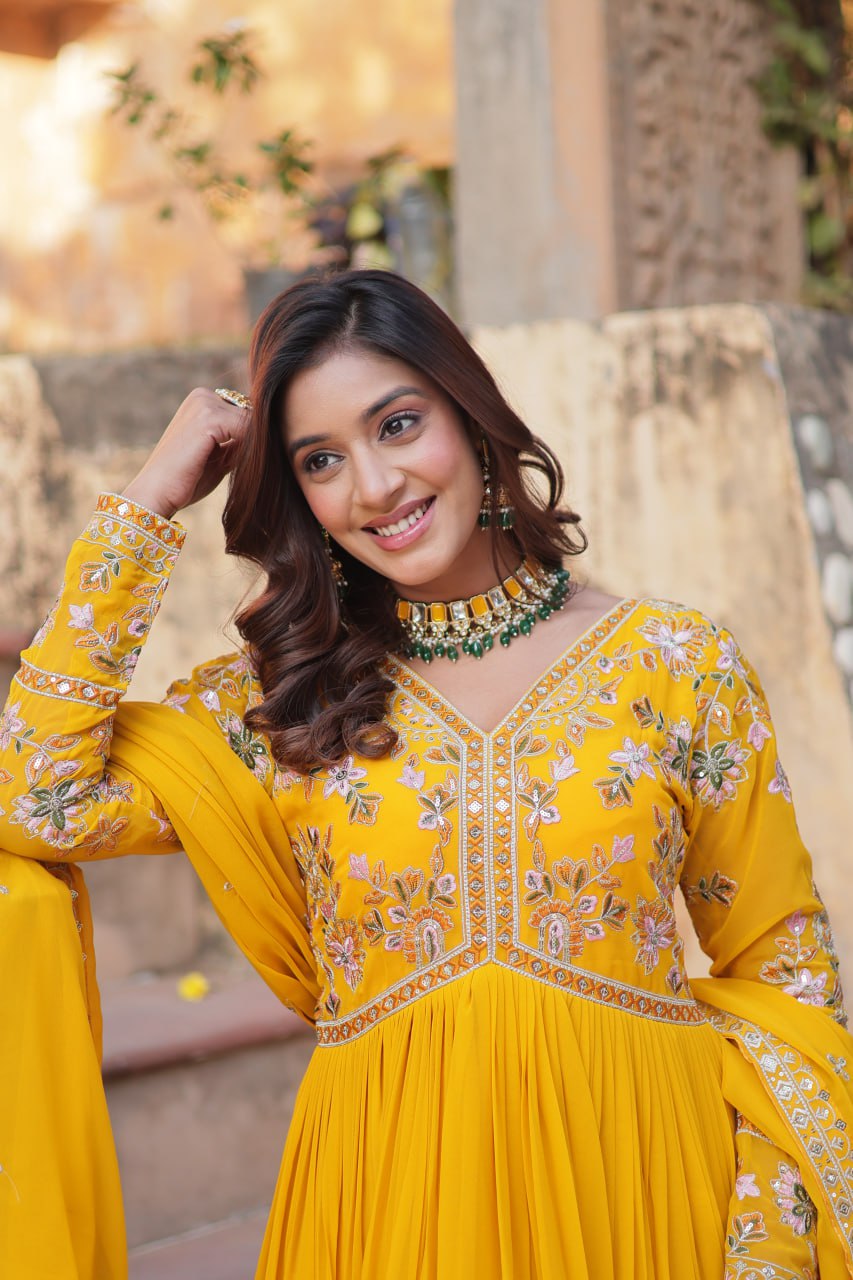 - Fabric & Work: Crafted from faux blooming fabric, featuring exquisite embroidery, zari, and sequins work for a rich, radiant look.