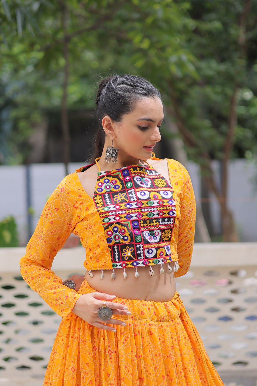 Celebrate the spirit of Garba with this stunning Bandhej Print Lehenga Set, designed for elegance, comfort, and festive flair! โจ