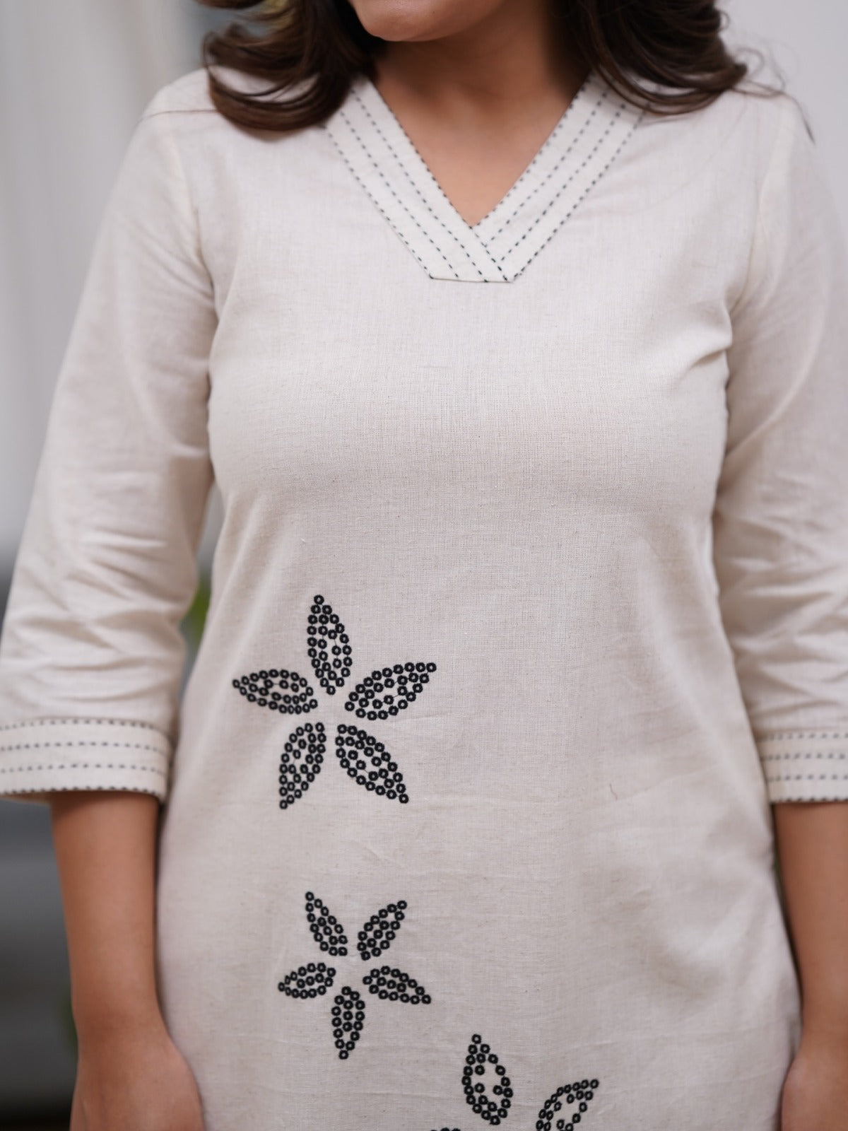 Elevate your ethnic wardrobe with this Off White Embroidered Cotton Kurta and Pant Set. Crafted from breathable cotton, it ensures comfort throughout the day while the intricate embroidery adds a touch of elegance. Perfect for festive occasions or casual gatherings, this set combines traditional charm with modern style for a graceful look.