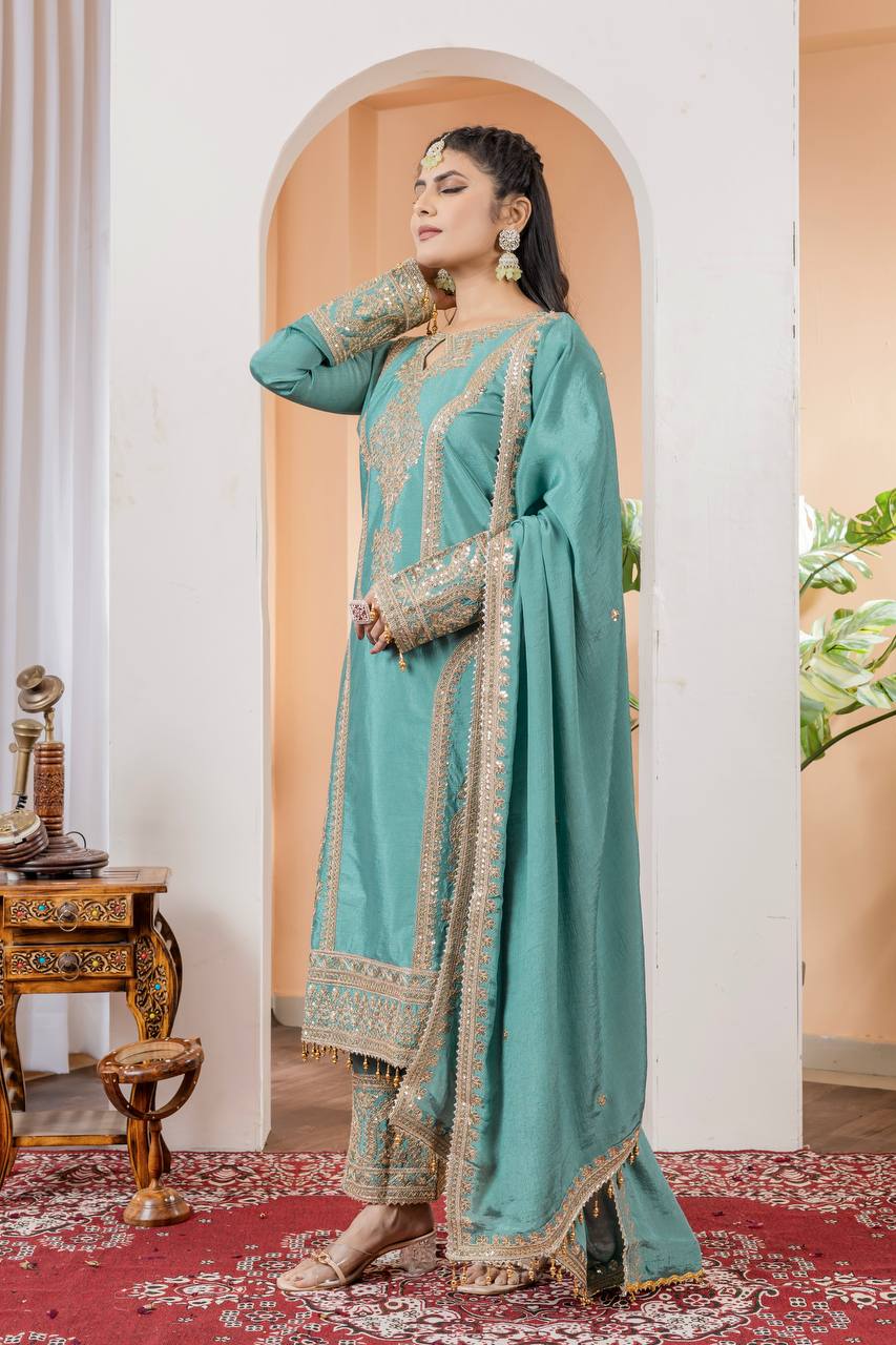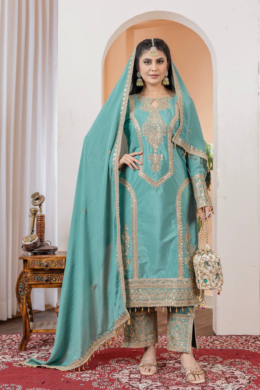 This enchanting set in Pur Chinon Silk is designed to make a statement at weddings, parties, and festive occasions. The combination of rich fabrics, intricate embroidery, and elegant finishes will ensure you shine on any special day.