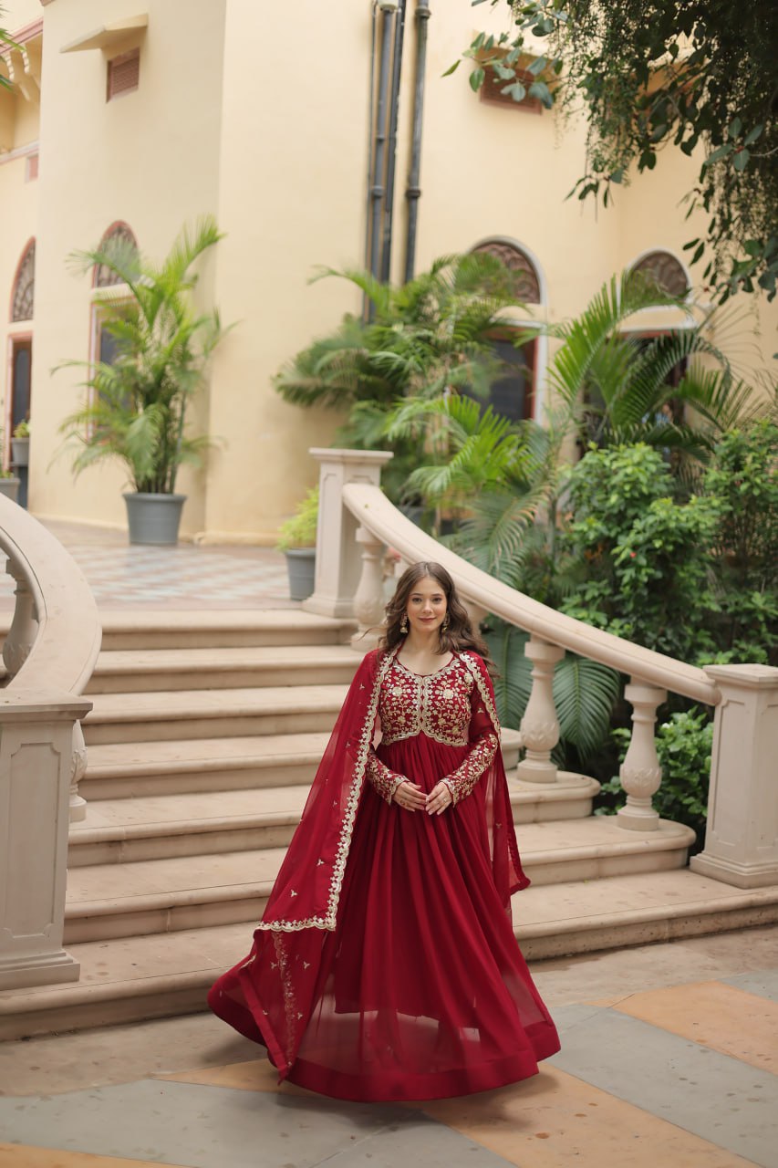 Introducing our Faux Blooming Gown, adorned with Sequins and Multi-Embroidered Work! This gown combines the elegance of western and Indian styles, designed to flatter all body types and make you feel graceful. π