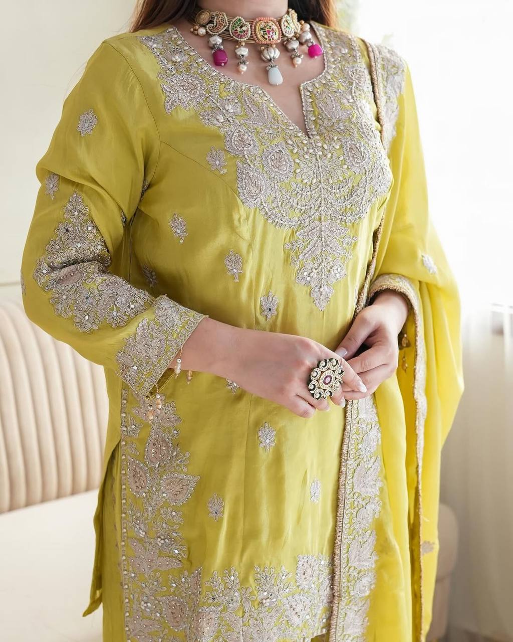 A stunning addition to your wardrobe, this fully stitched ready-to-wear set is designed to offer both style and comfort. Perfect for weddings, parties, or any festive occasion, this set is adorned with intricate embroidery and sequence work, making it a showstopper!