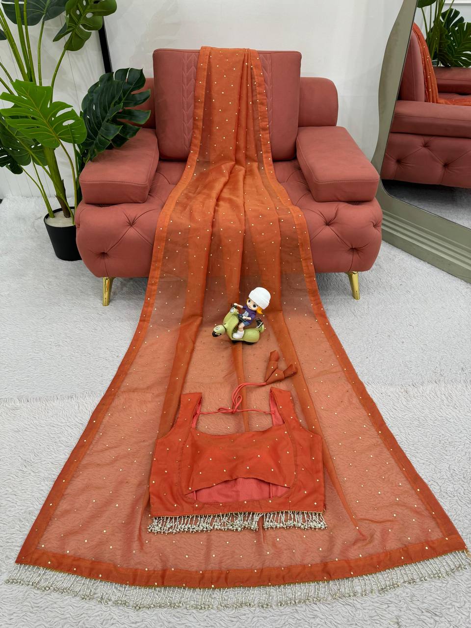 Turn heads with this stunning designer saree in the same captivating shade, crafted from luxurious Chimar Tissue Silk. Adorned with elegant Mukesh work and finished with Heavy Fancy Lace, this ensemble is a perfect blend of tradition and trend. The blouse, made from the same rich fabric, mirrors the saree’s detailing with exquisite craftsmanship on both the front and back.