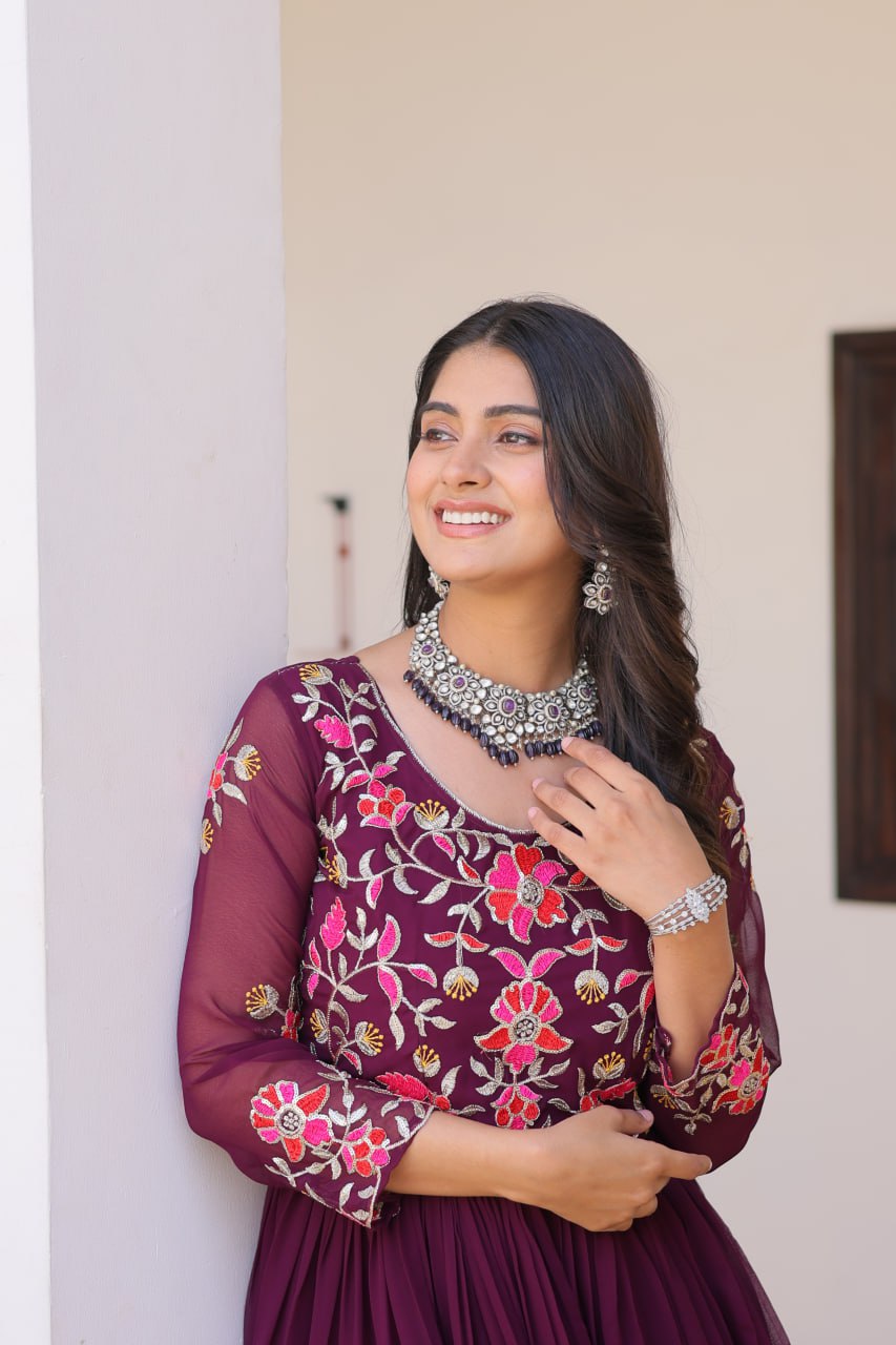 This gown is designed for grand occasions with its rich sequence thread work and a large, flowing flair of 7.50 meters, giving it a luxurious and elegant look. The micro cotton inner lining ensures comfort, while the Fox Georgette fabric adds to the grandeur.